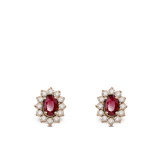 Rose gold earrings decorated with oval cut rubies and diamonds set in a miracle setting. These earrings are also available with semi-precious stones. The actual size of the central gemstone is 6x4mm.